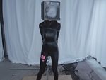 エナメルボディースーツ+エナメルレオタード+エナメルグローブ+エナメルニーハイブーツで全身を完璧な光沢人形に改造されたヨーヨー。そんな彼女をマスターは天井から吊り、じわじわと責め始めます。引きの画で見 ...